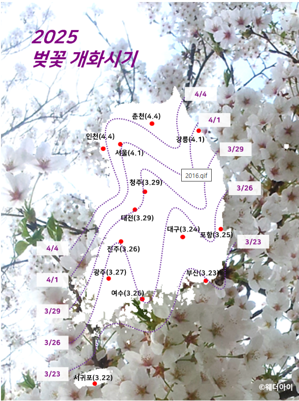 웨더아이에서 발표한 벚꽃 개화 예상시기는 평년보다 3~8일 정도 빠를 것으로 예상하고 있습니다. 하지만, 벚꽃의 개화는 3월 중 기온변화에 따른 영향이 크므로 개화 예상시기와는 다를 수 있습니다.